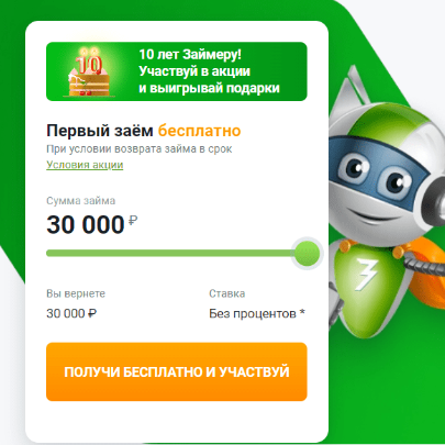 - Первый займ для новых клиентов - 0% (для повторных - 1%) - Первый заём бесплатно (без процентов) на срок от 7 до 30 дней, для новых клиентов и сумма 30000 - Без скрытых подписок и комиссий - Рассмотрение заявки до 5 минут - Возможность получения второго займа до погашения предыдущего